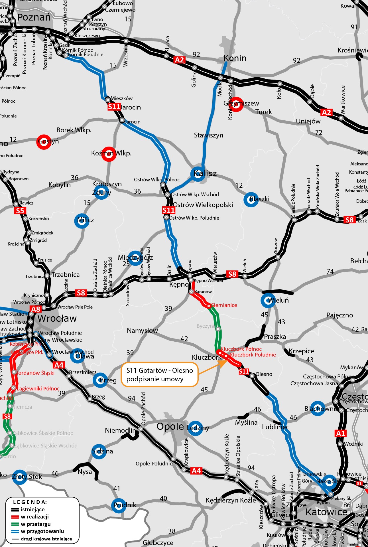 Do 2030 roku cała S11 połączy leżący na Pomorzu Środkowym Kołobrzeg przez Piłę, Poznań i Kępno z Aglomeracją Śląską. Po realizacji wszystkich odcinków trasa będzie liczyć ponad 580 km, a wraz ze wspólnym przebiegiem S6 od Kołobrzegu do Koszalina (ok. 35,5 km) blisko 620 km. Obecnie kierowcy mają do dyspozycji ponad 150 km (wliczając wspólny przebieg S6 i S11). Dla pozostałych odcinków, w zależności od etapu, inwestycje są już realizowane bądź prowadzone są prace przygotowawcze. W nadchodzących latach pokonanie trasy z Kołobrzegu na Śląsk zajmie nieco ponad 5 godzin.