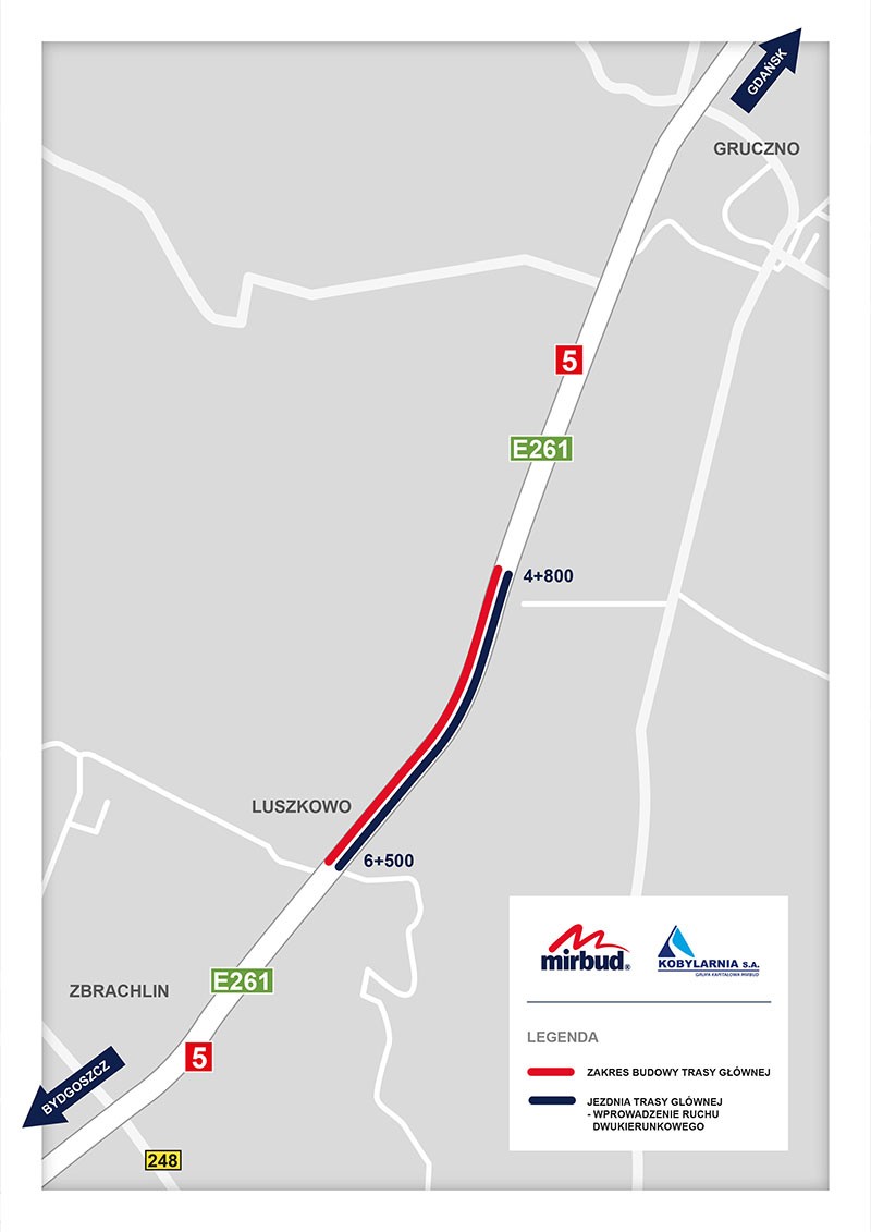 Zamiast dotychczasową, starą DW5 kierowcy będą poruszać się nową, prawą jezdnią drogi ekspresowej S5. Ruch będzie się odbywał po warstwie wiążącej. W tym czasie wykonujące prace konsorcjum firm KOBYLARNIA S.A. oraz MIRBUD S.A. będzie prowadzić prace ziemne na docelowej jezdni lewej.