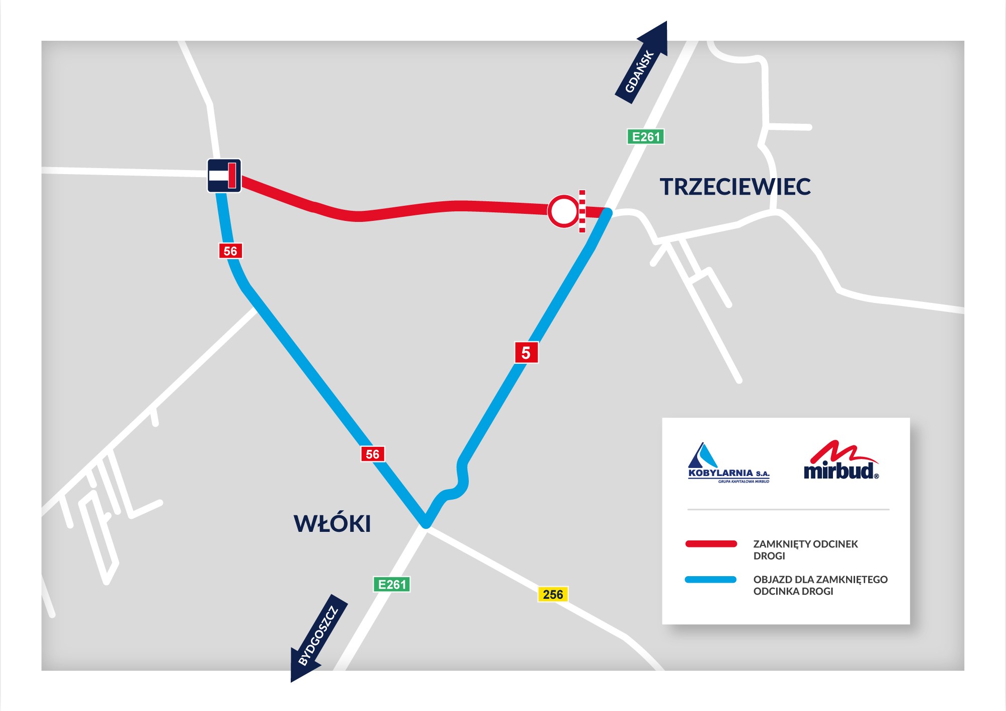 Objazd zostanie poprowadzony drogą nr 56 zgodnie z poniższą mapą poglądową. Zmiana zostanie wprowadzona w związku z budową drogi ekspresowej S-5 na odcinku Dworzysko – Aleksandrowo i potrwa do czerwca 2021 roku.