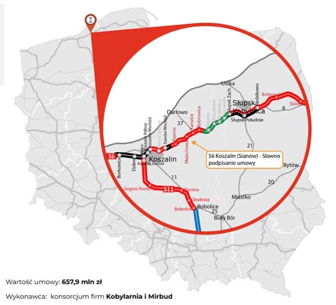 30 września br. w Sławnie koło Słupska konsorcjum firm z Grupy MIRBUD: KOBYLARNIA S.A. i MIRBUD S.A. podpisało umowę z Generalną Dyrekcją Dróg Krajowych i Autostrad na budowę drogi ekspresowej S6 na odcinku od Koszalina do Sławna.