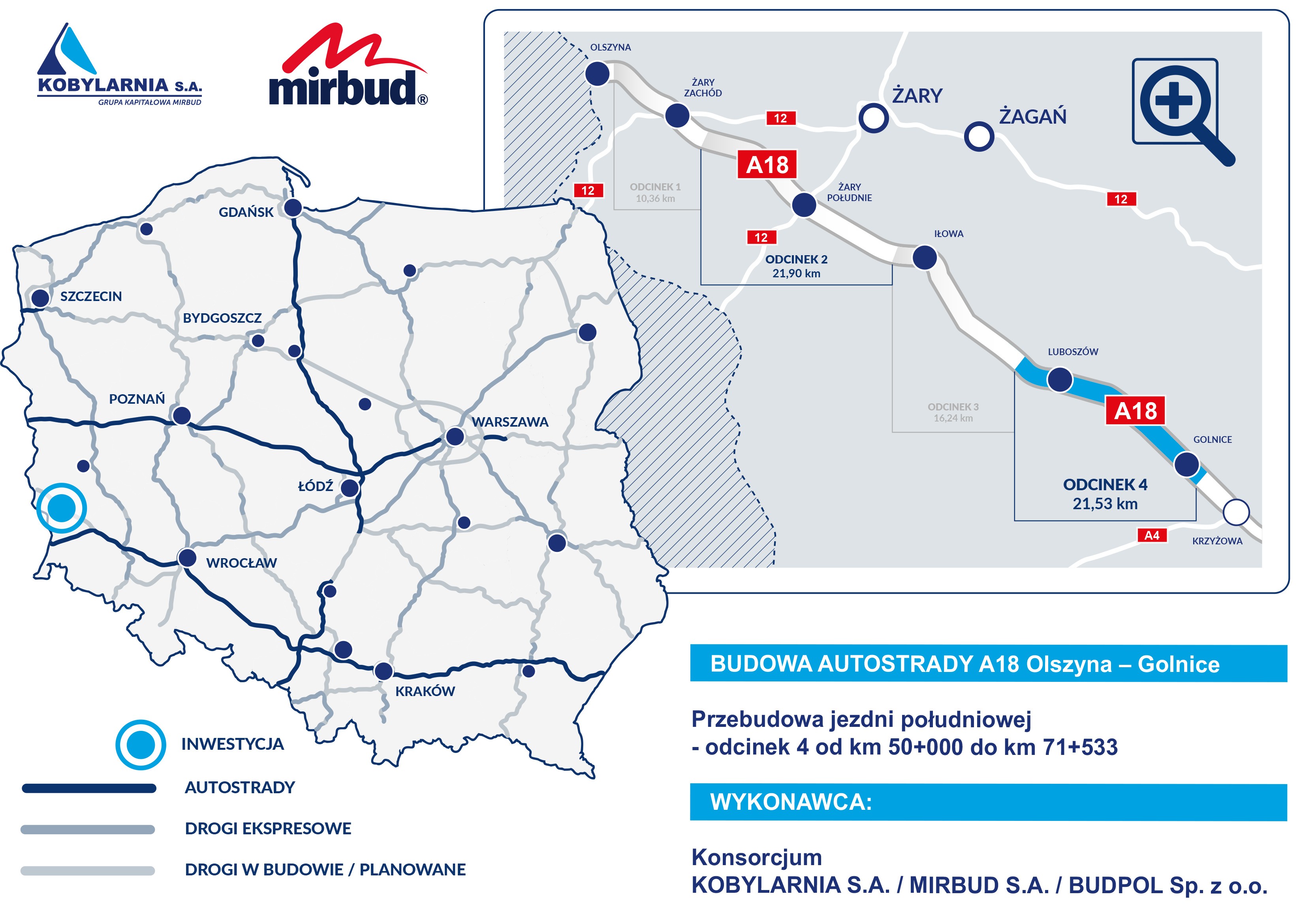 Projekt będzie realizowany w formule „Buduj” i dotyczy przebudowy jezdni południowej obecnej drogi krajowej nr 18, a także dostosowanie jej parametrów do parametrów autostrady. Oznacza to, że dotychczasowa jezdnia pozyska nie tylko nową, betonową nawierzchnię, ale zostanie również poszerzona z 7 do 11 metrów. Zadanie zrealizuje konsorcjum firm, którego liderem jest KOBYLARNIA S.A., partnerami: MIRBUD S.A. oraz BUDPOL Sp. z o.o.. Wartość kontraktu to 258 700 000,01 zł brutto. 80% wartości kontraktu zrealizują spółki Grupy Kapitałowej MIRBUD.