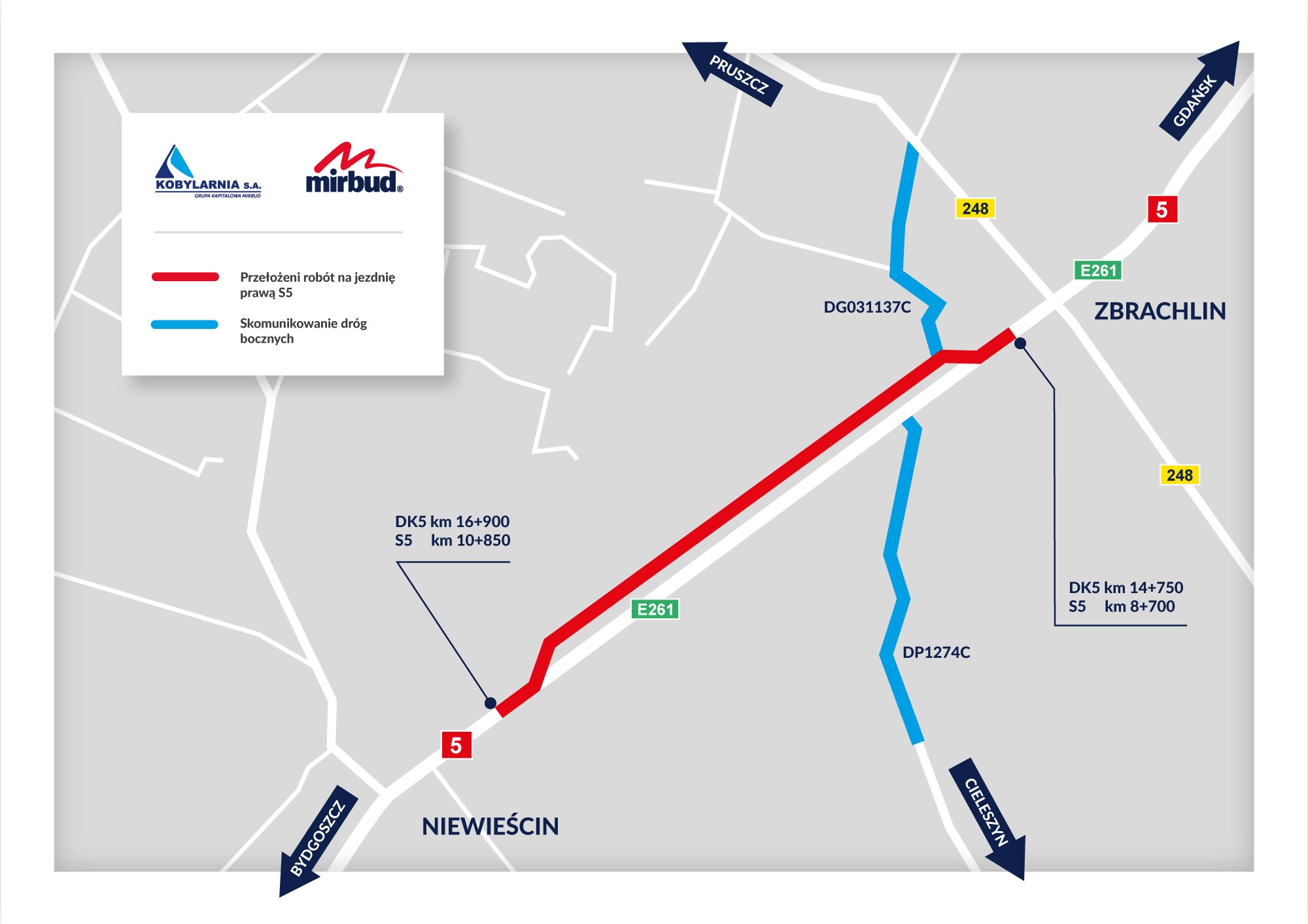 Zmiana zostanie wprowadzona od godz. 13 na odcinku obecnej drogi krajowej nr 5 od miejscowości Zbrachlin do miejscowości Niewieścin. Wprowadzenie organizacji polegać będzie na przełożeniu ruchu z DK5 na nowo budowaną jezdnię prawą drogi ekspresowej S5.