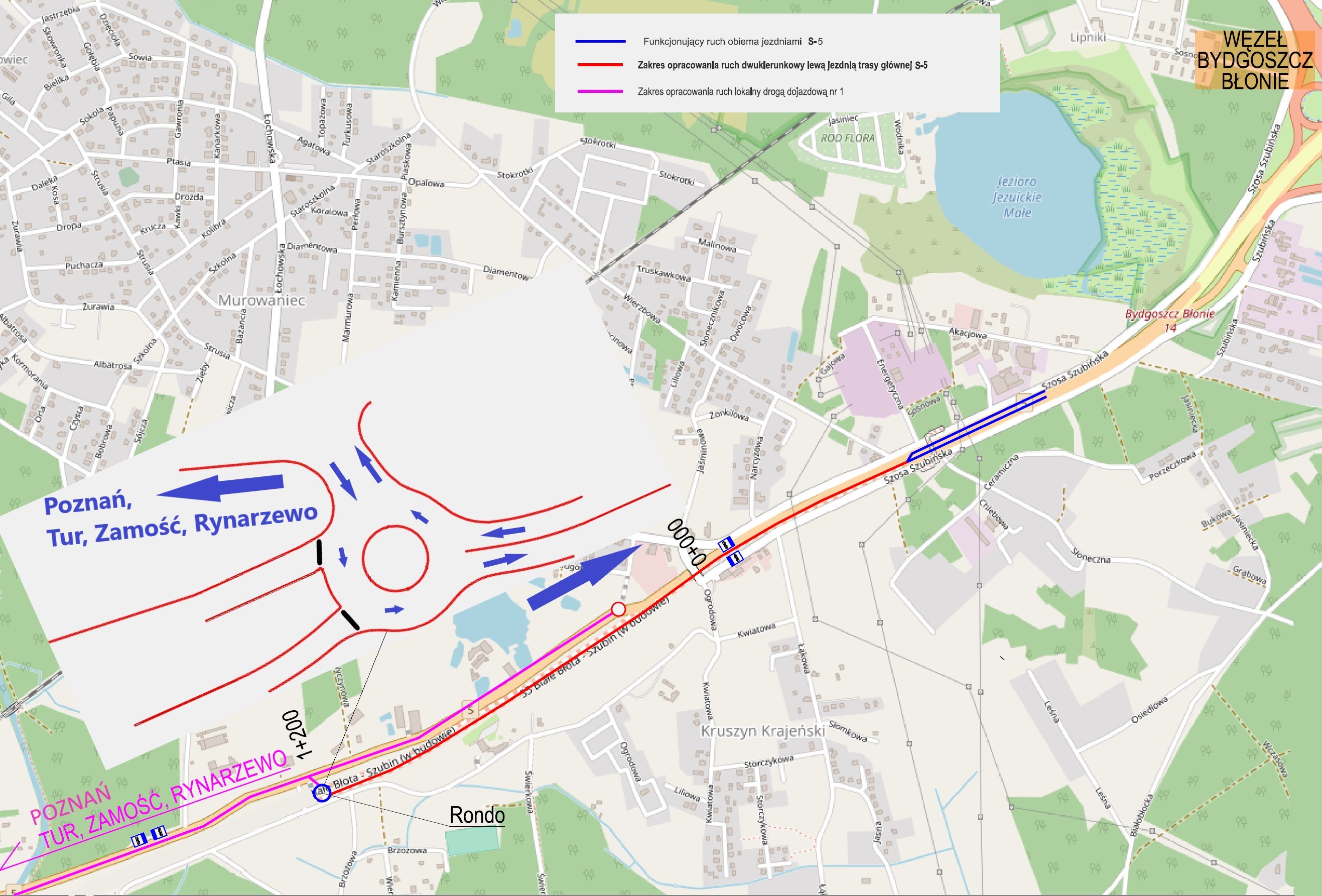 Wprowadzona organizacja ruchu na w/w łączniku z węzłem Bydgoszcz Błonie umożliwi Wykonawcy podjęcie prac na remontowanej jezdni prawej oraz dokończenia niezbędnych prac na drodze dojazdowej nr 1, co pozwoli na skomunikowanie terenów przyległych bez wprowadzania dodatkowych utrudnień związanych z podłączeniem tych obszarów z obecnym układem drogowym.