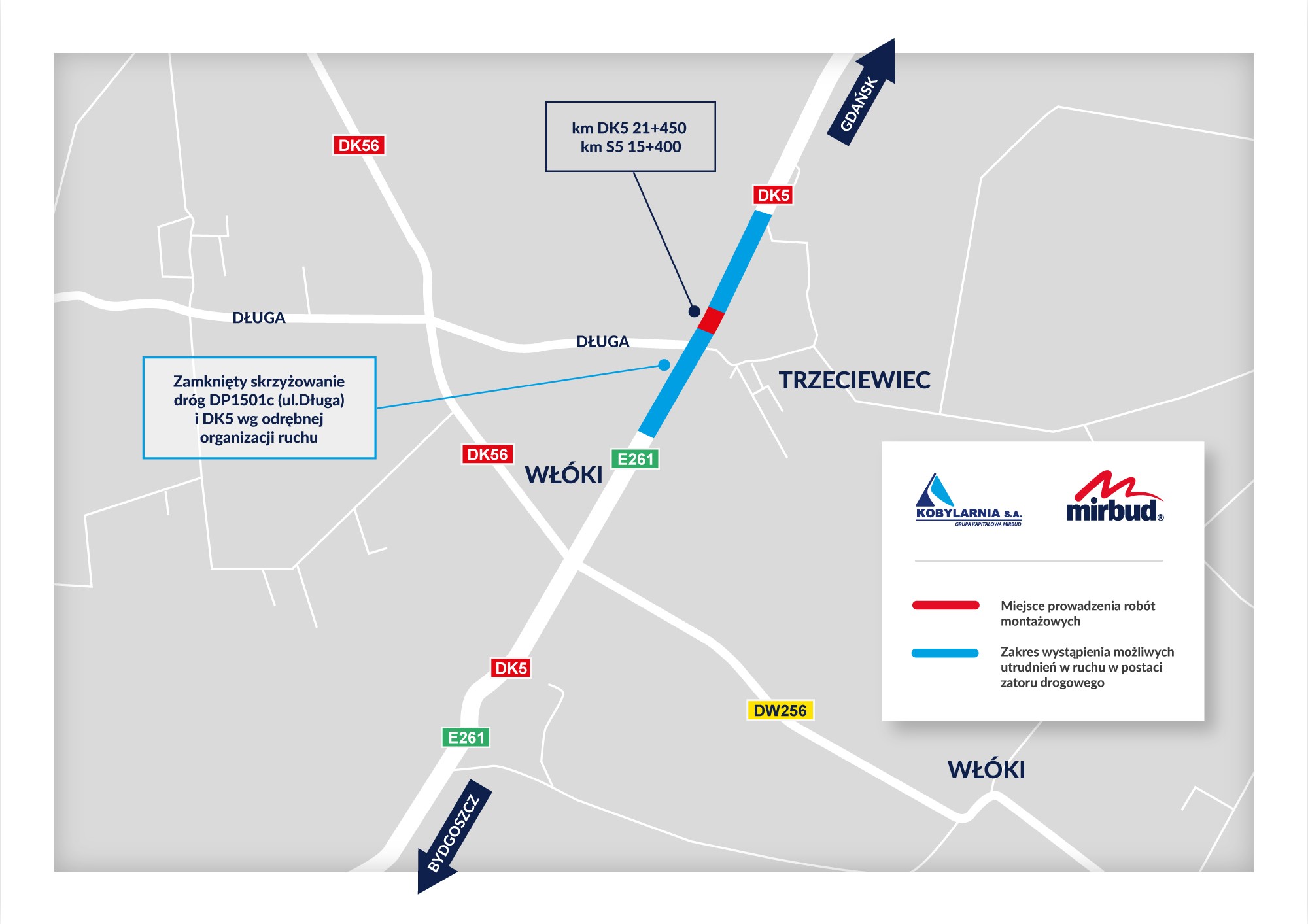 Wprowadzenie tymczasowej organizacji polegać będzie na czasowym, całkowitym zatrzymaniu ruchu na DK5 w związku z montażem przęseł obiektu mostowego KDP2-4a. Ruch pojazdów będzie zatrzymywany kilkakrotnie, jednak na nie dłużej niż 20 minut.