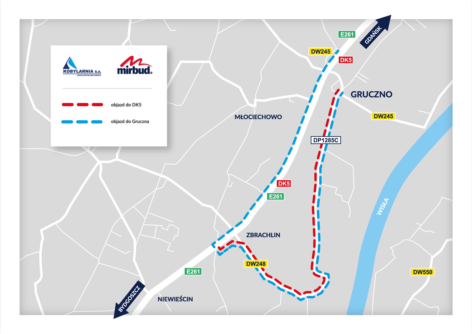 Od wtorku, 1 czerwca zmianie ulegnie organizacja ruchu w okolicy miejscowości Gruczno. Zmiana zostaje wprowadzona w związku z budową drogi ekspresowej S-5 przez konsorcjum firm KOBYLARNIA S.A. i MIRBUD S.A.