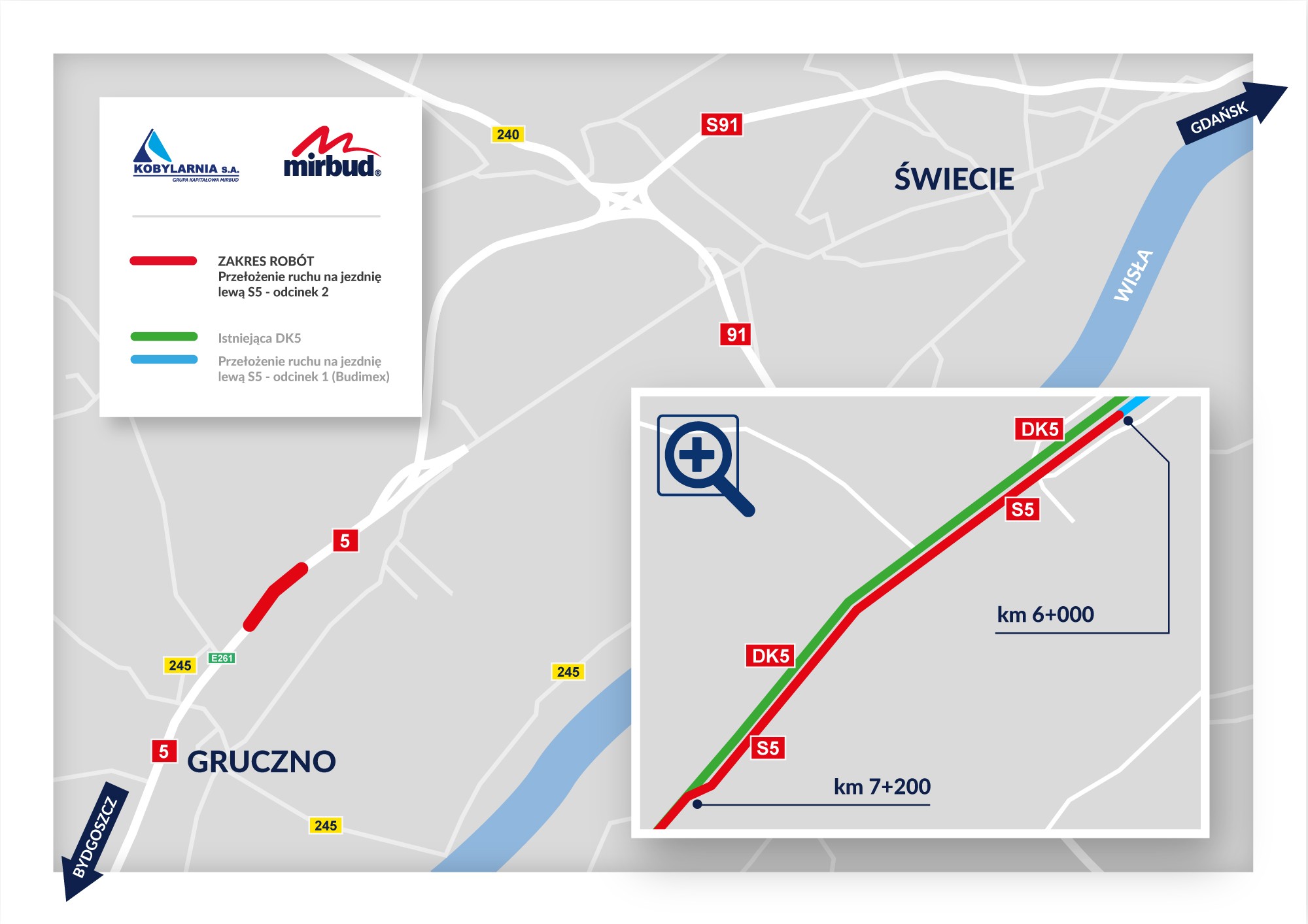 Zmiana dotyczy odcinka w okolicach miejscowości Gruczno i będzie polegać na przełożeniu ruchu z dotychczasowej DK5 na wybudowaną jezdnię lewą nowej drogi ekspresowej S5. Miejsce przełożenia ruchu z DK5 na S5 znajdować się będzie na odcinku 1, wykonywanym przez firmę Budimex i ruch tą jezdnią będzie kontynuowany poprzez odcinek 2, którego wykonawcą jest konsorcjum firm KOBYLARNIA S.A. i MIRBUD S.A. Ruch na jezdni nowej drogi ekspresowej S5 odbywać się będzie dwukierunkowo po pasach ruchu o szerokości 3,5 m.